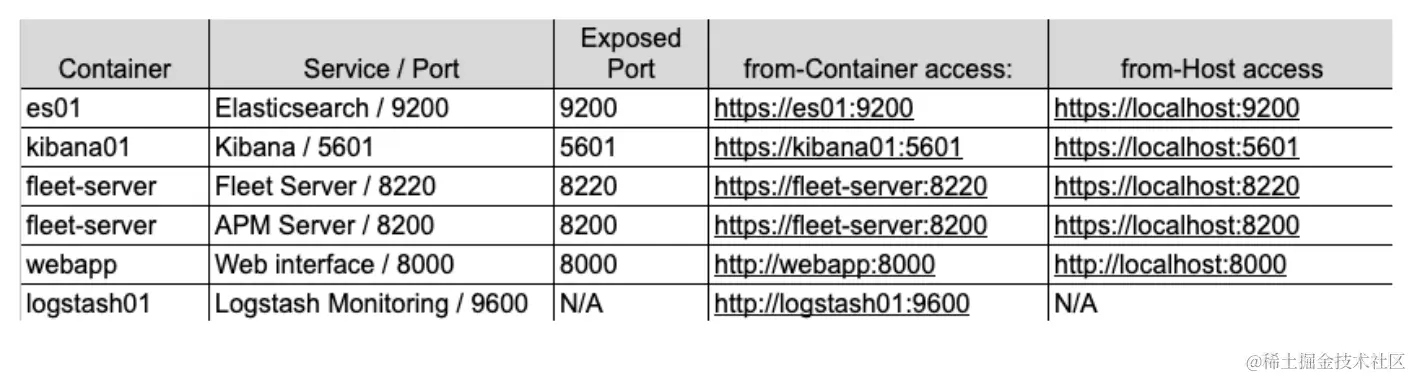 最后,在引用这些服务之一时决定使用哪个地址可能很棘手。 要记住的关键是,当你的一个容器正在访问已配置 Elastic 网络的另一个容器时,请使用正确的服务/容器名称。 但是,如果来自主机的流量正在访问其中一个容器,那么你将需要验证 docker-compose.yml 中是否公开了正确的端口,并通过 localhost 访问该端口。