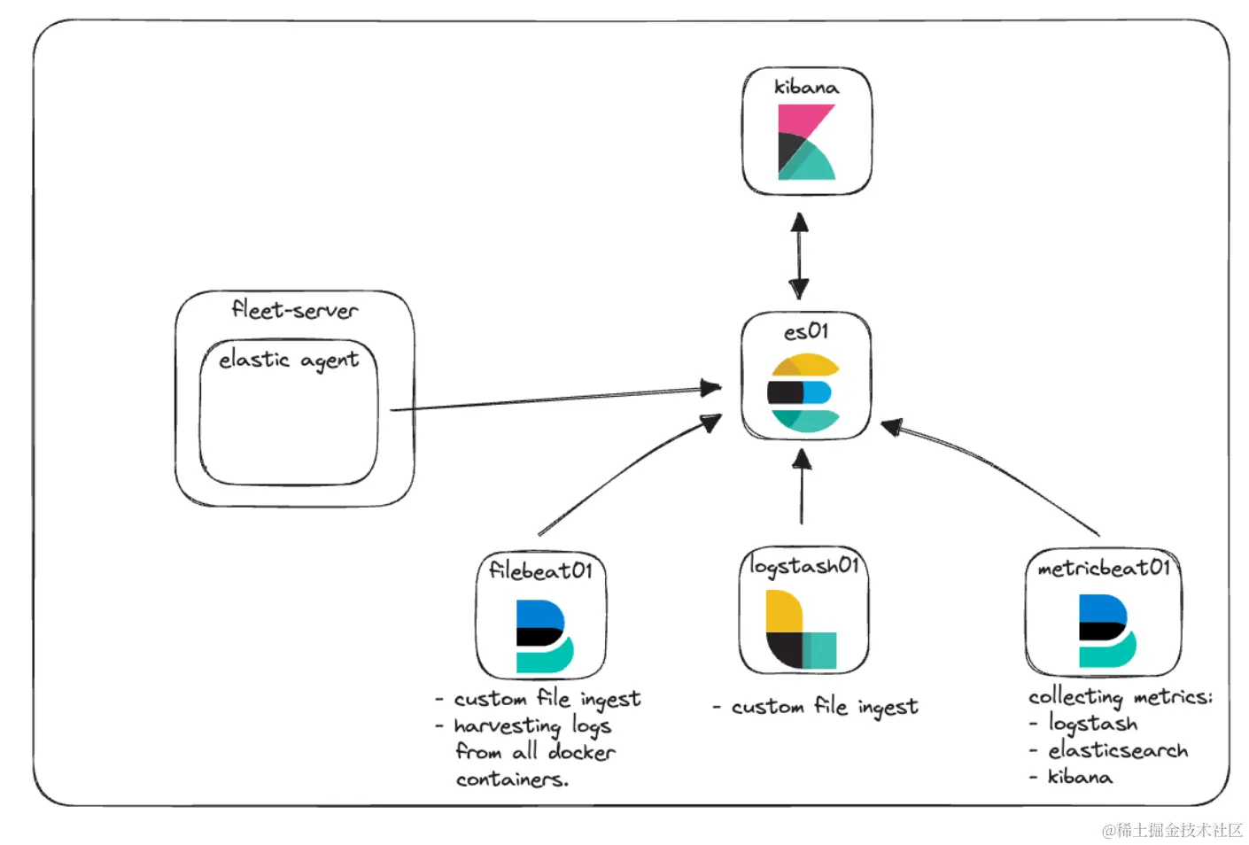 我们将集成 Elastic Agent 和 Fleet,以演示如何收集日志和指标以及管理策略。 让我们将其添加到架构图中,看看它会是什么样子。