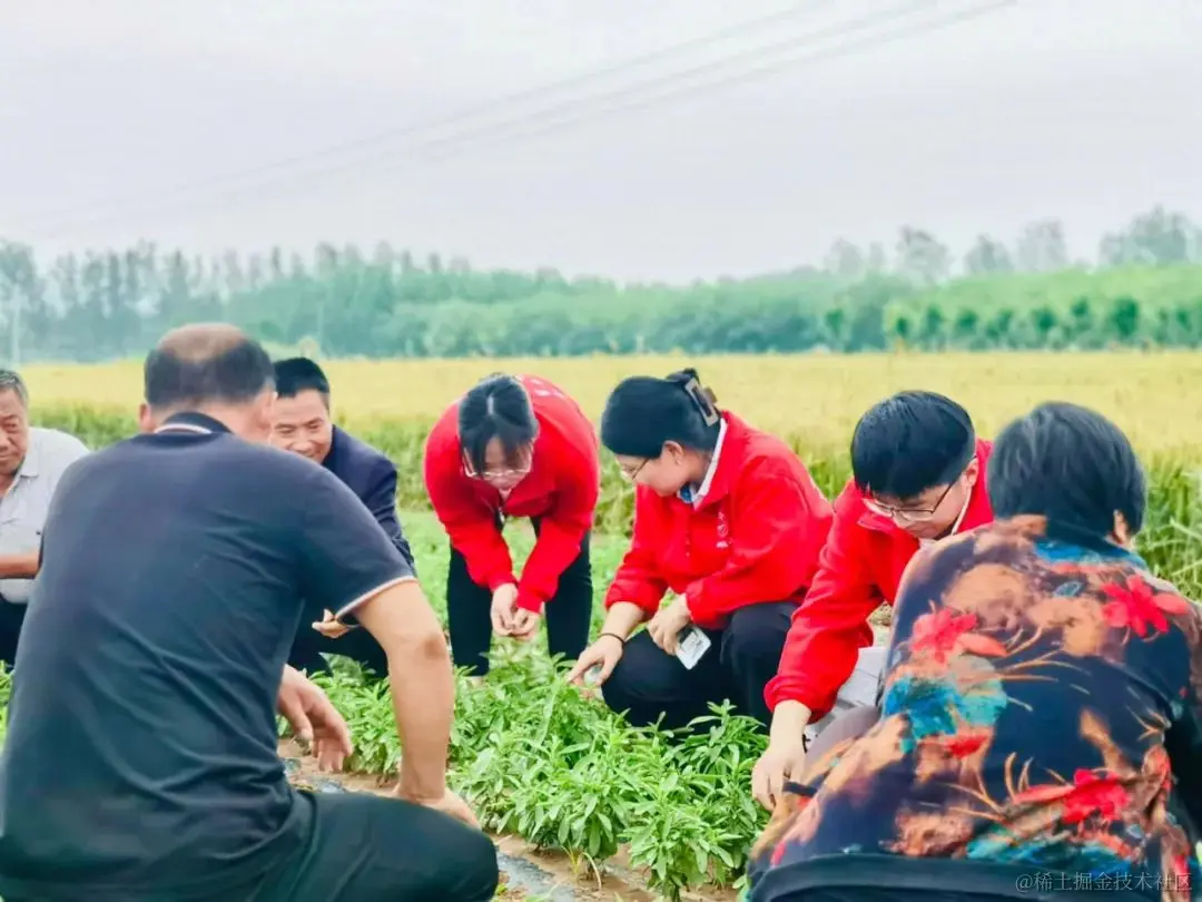 曲周县甜叶菊团队与村民一起观察田里甜叶菊长势 图源:曲周县甜叶菊团队