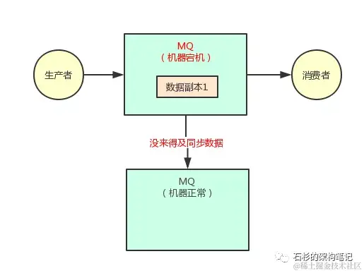 但凡刚写一台机器他就宕机,还没来得及复制到另外一台机器的话,本次写应该报错失败,然后你应该重试再次写入数据到MQ集群里去。