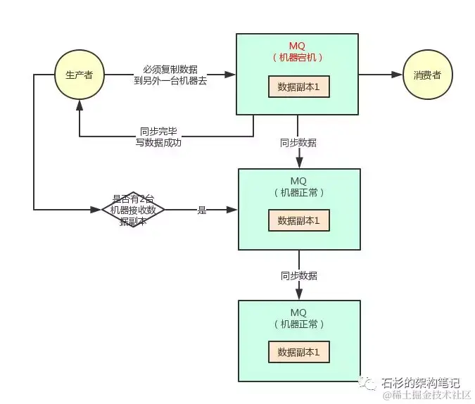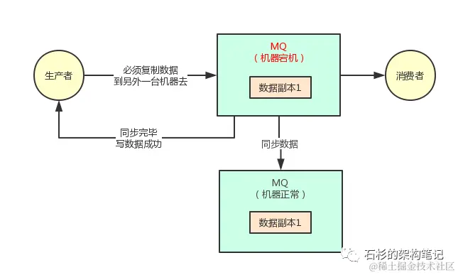 所所以对于采用这种机制的时候,你必须得让生产者通过一些参数的设置,保证说写一条消息到某台机器,他必须同步这条消息到另外一台机器成功,集群里有双副本了,然后此时才可以认为这条消息写成功了。