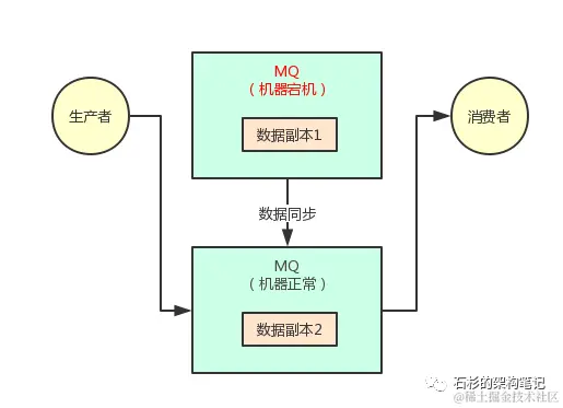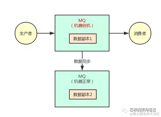 上面的图里,MQ采用集群模式部署到了2台机器上去,然后生产者给其中一台机器写入一条消息,该机器自动同步复制给另外一台机器。