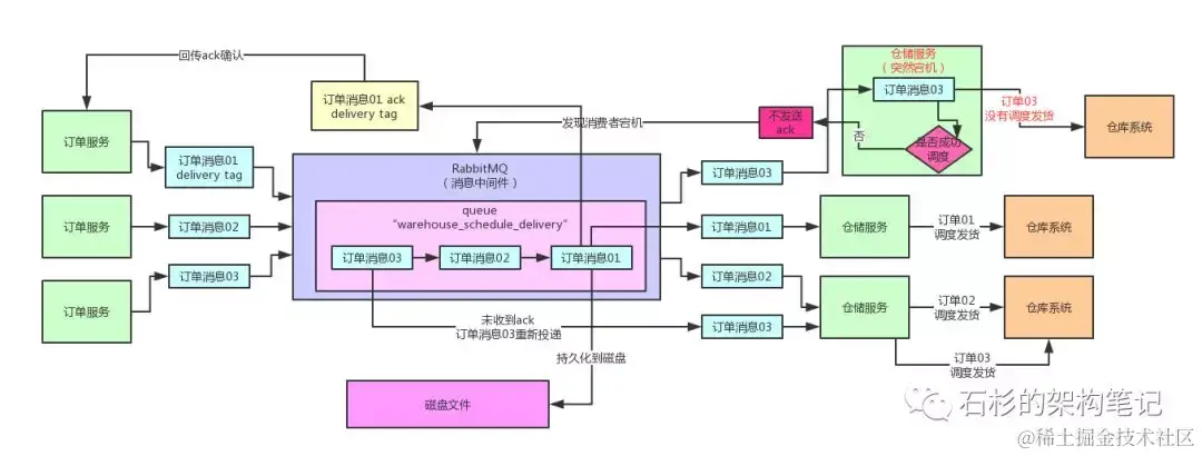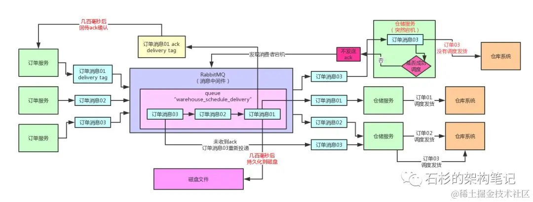 很简单,就是生产端(比如上图的订单服务)首先需要开启一个confirm模式,接着投递到MQ的消息,如果MQ一旦将消息持久化到磁盘之后,必须也要回传一个confirm消息给生产端。