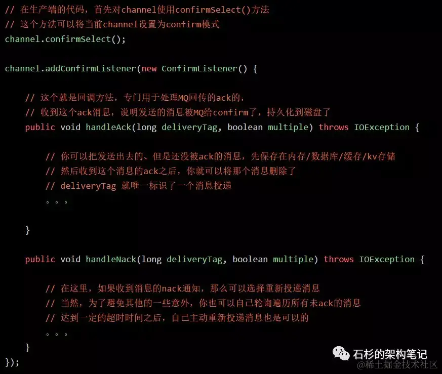 其次,投递消息之后等待ack的过程必须是异步的,也就是类似上面那样的代码,已经给出了一个初步的异步回调的方式。