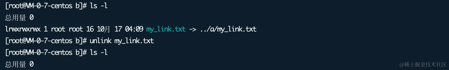 当然也可以使用 unlink 命令,但是不要直接使用软链接的名称,因为它不仅仅用于删除链接,还会删除文件。