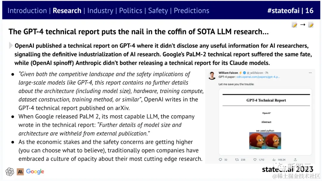 OpenAI 公布了 GPT-4 非常有限的技术报告,Google 在 PaLM 2 的发布会上几乎没有发布什么有价值的信息,Anthropic 根本没有公开 Claude 和 Claude 2 的技术细节。