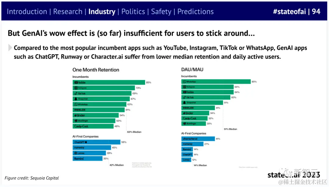 但根据红杉资本的数据,目前有理由怀疑生成式 AI 产品的持久力——从图像生成到 AI 助手,几乎所有 AI 产品的用户留存率都不稳定。