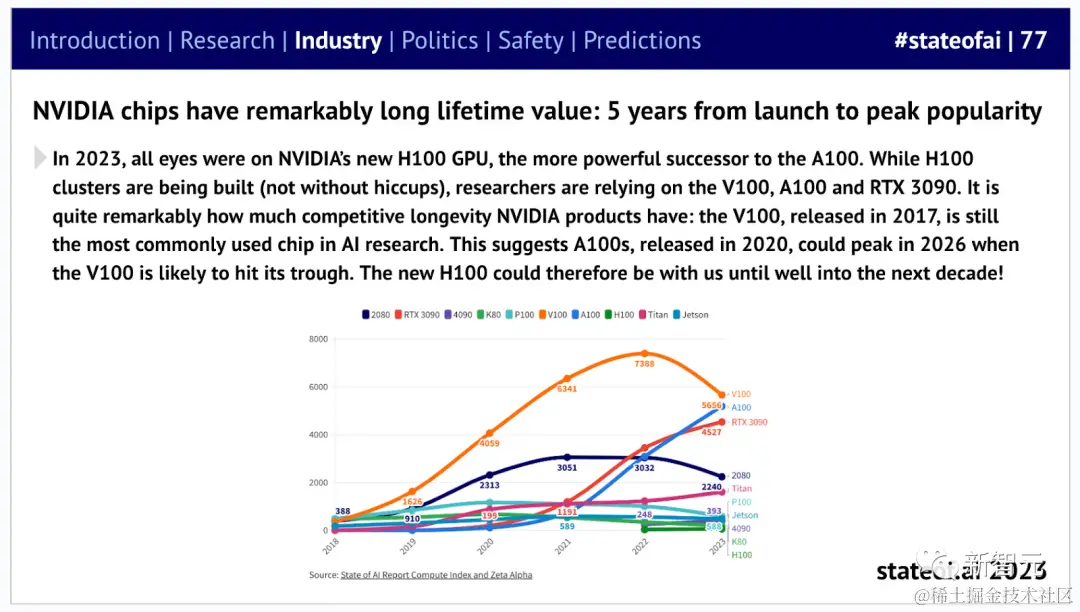 2017 年发布的 V100 是 2022 年 AI 研究论文中最受欢迎的 GPU。