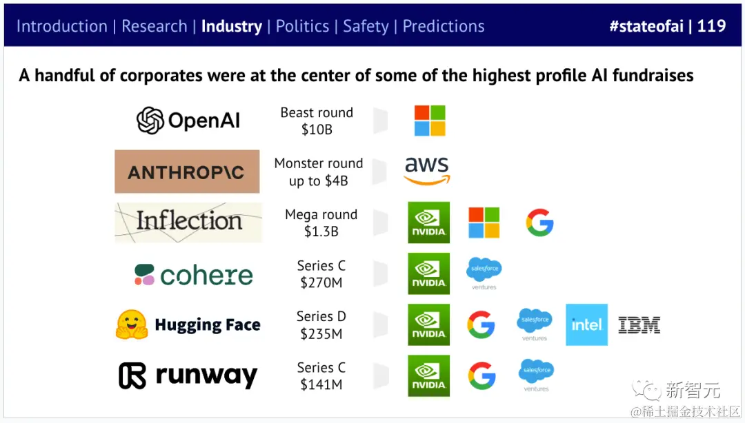 产业层面,作者从硬件基础设施(英伟达赢麻了),行业投融资风向,明星独角兽等方面,给读者呈现了技术走出实验室落地的成果。