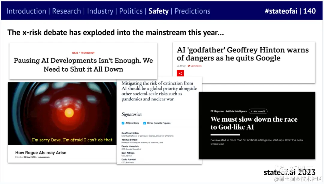 2023 年就演变为了 AI 风险争论的一年,研究人员之间的「公开与封闭」争论愈演愈烈,「AI 灭绝人类风险」屡次成为头条新闻。