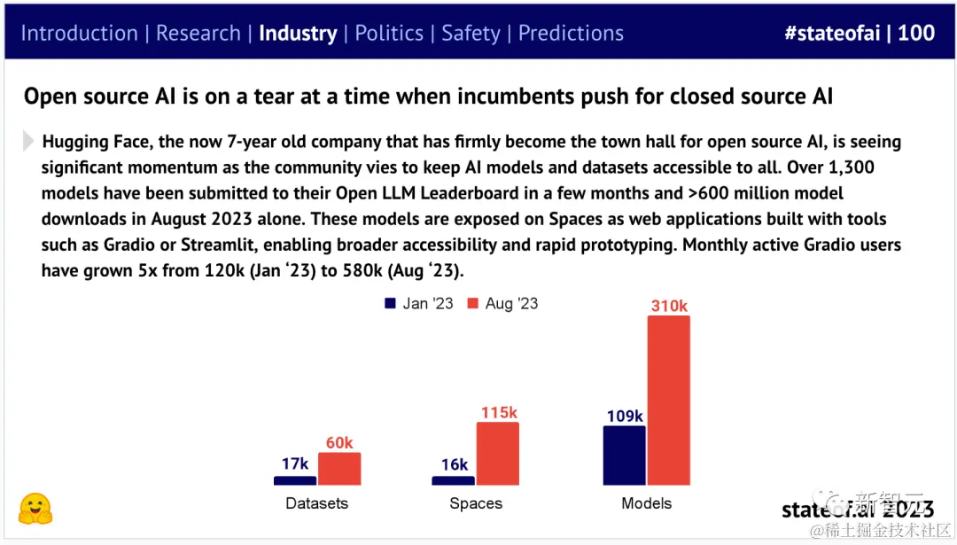 从 Hugging Face 的排行榜来看,开源比以往任何时候都更加活跃,下载量和模型提交量飙升至历史新高。