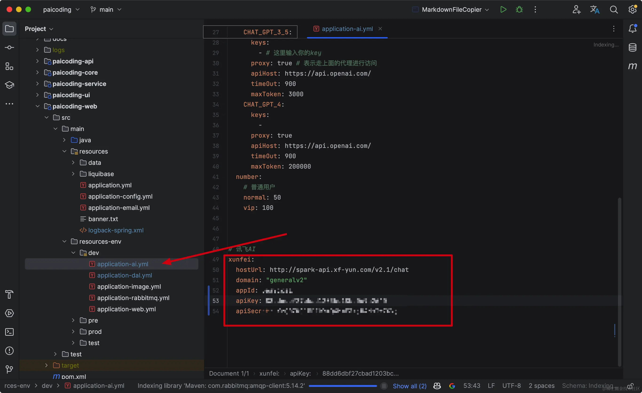 导入到 Intellij IDEA 中后,找到 dev 下的 application-ai.yml 文件,把讯飞的 appid、APISecret、APIKey 填写到这里。
