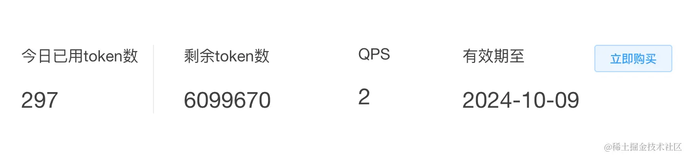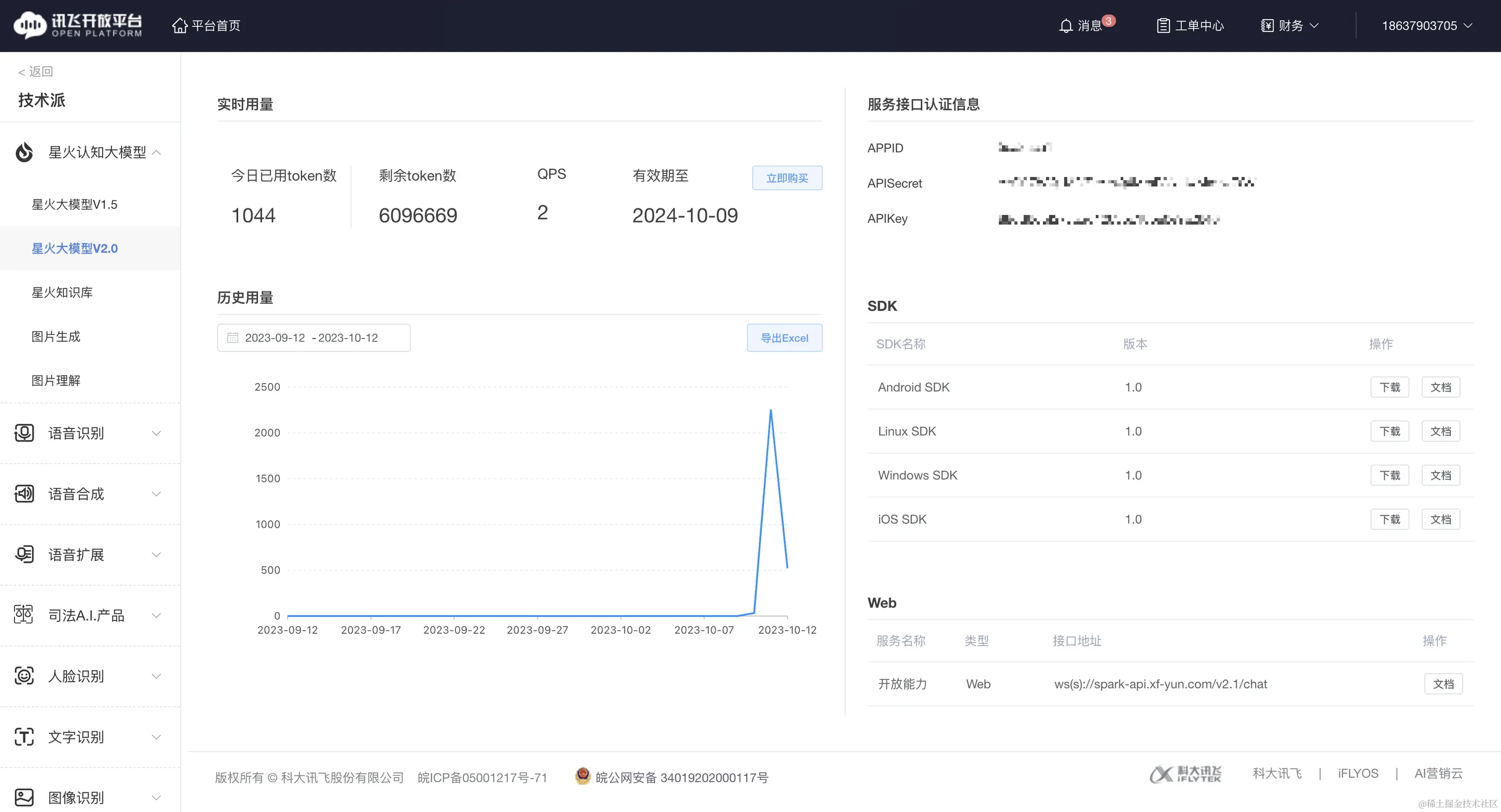之后就可以在控制台看到领取的 token 数,以及应用的 appid、APISecret、APIKey 了。