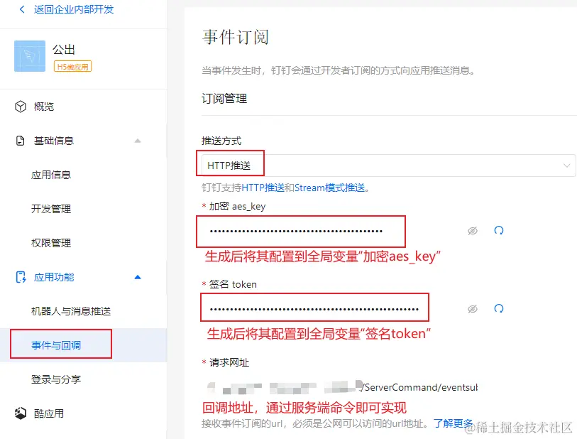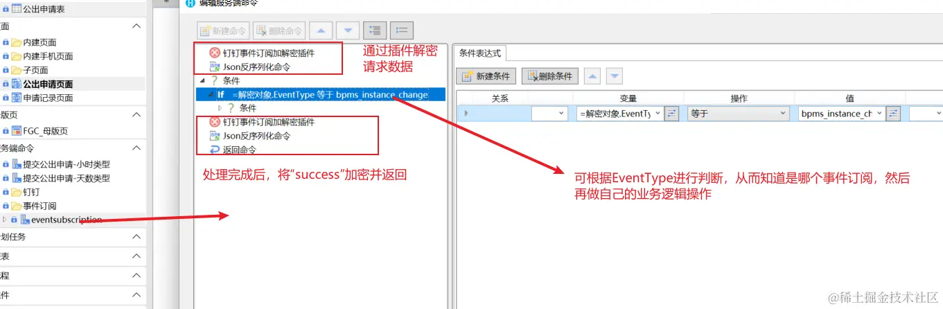 对于请求地址,可创建一个任何人都能访问的,post类型的服务端命令。但因为钉钉的请求数据以及响应数据都是加密的,因此可以使用市场上的钉钉事件订阅加解密插件,可参考附件工程文件的服务端命令->事件订阅->eventsubscription。
