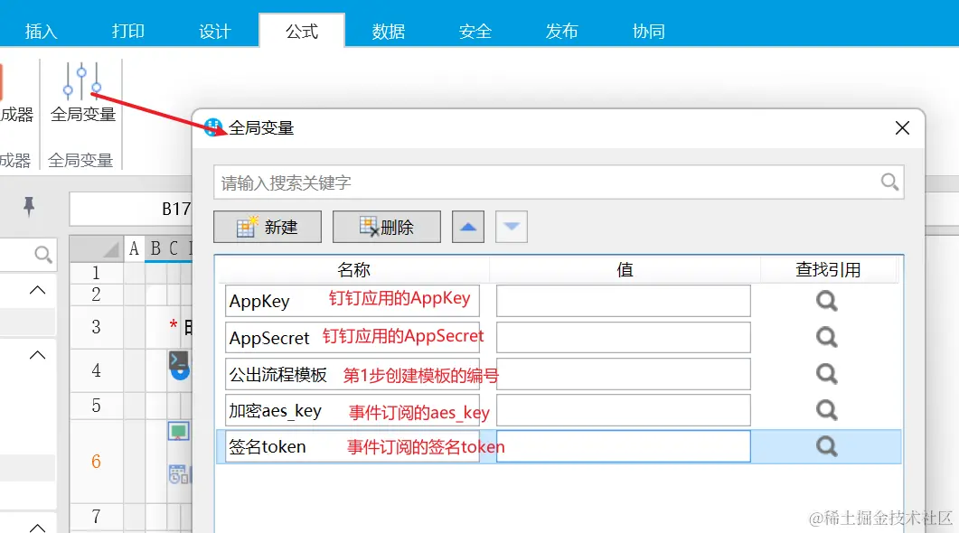 - 首先要获取accessToken,需要用到Appkey和AppSecret参数,调用发起审批时,需要用到模板的编号,可以将这些参数设置为全局变量,待发布后在管理控制台统一配置,如下图展示,后两个参数会在后面进行介绍。