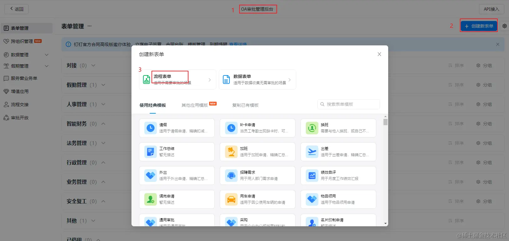 在钉钉管理后台中创建流程表单,进行自定义表单设计和流程设计,完成后点击右上角的发布即可。