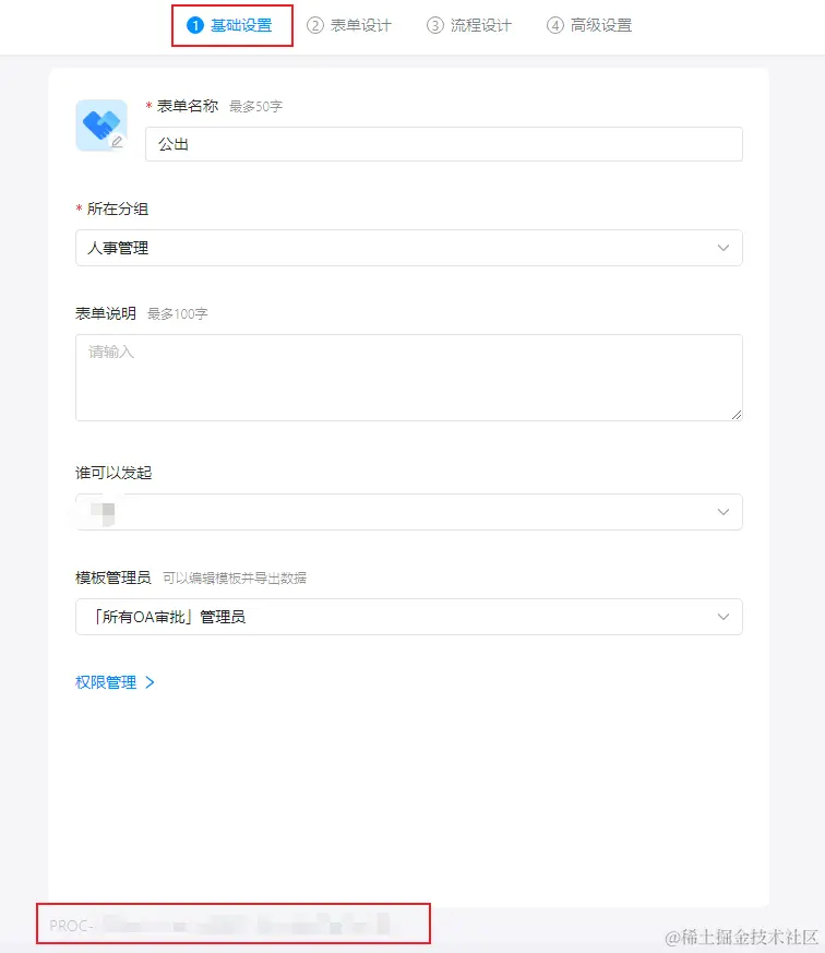 在基础设置页签的最下面,有该模板的唯一编号,这个也是后面发起流程中需要用到的。