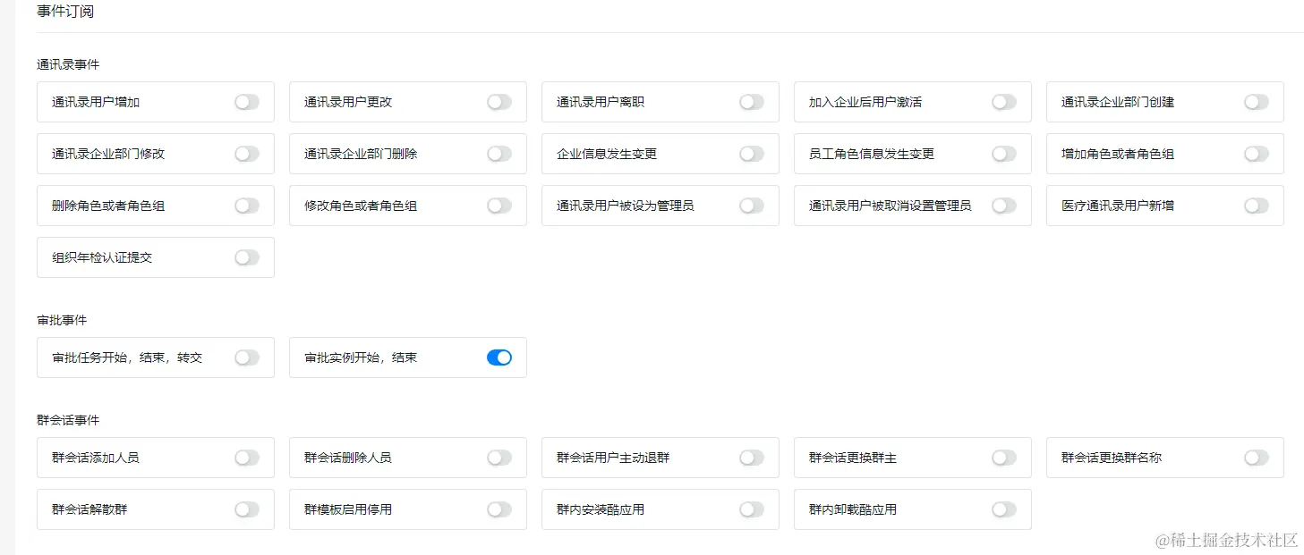 - 开启需要订阅的事件,不同的事件订阅,请求的数据结构有所不同,可以在事件订阅中进行查看。解密之后可以通过EventType做判断,然后结合实际业务逻辑进行处理。