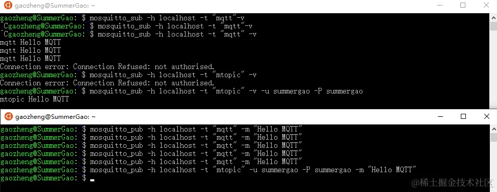 mosquitto_pub -h localhost -t "mtopic" -u summergao -P summergao -m "Hello MQTT"
