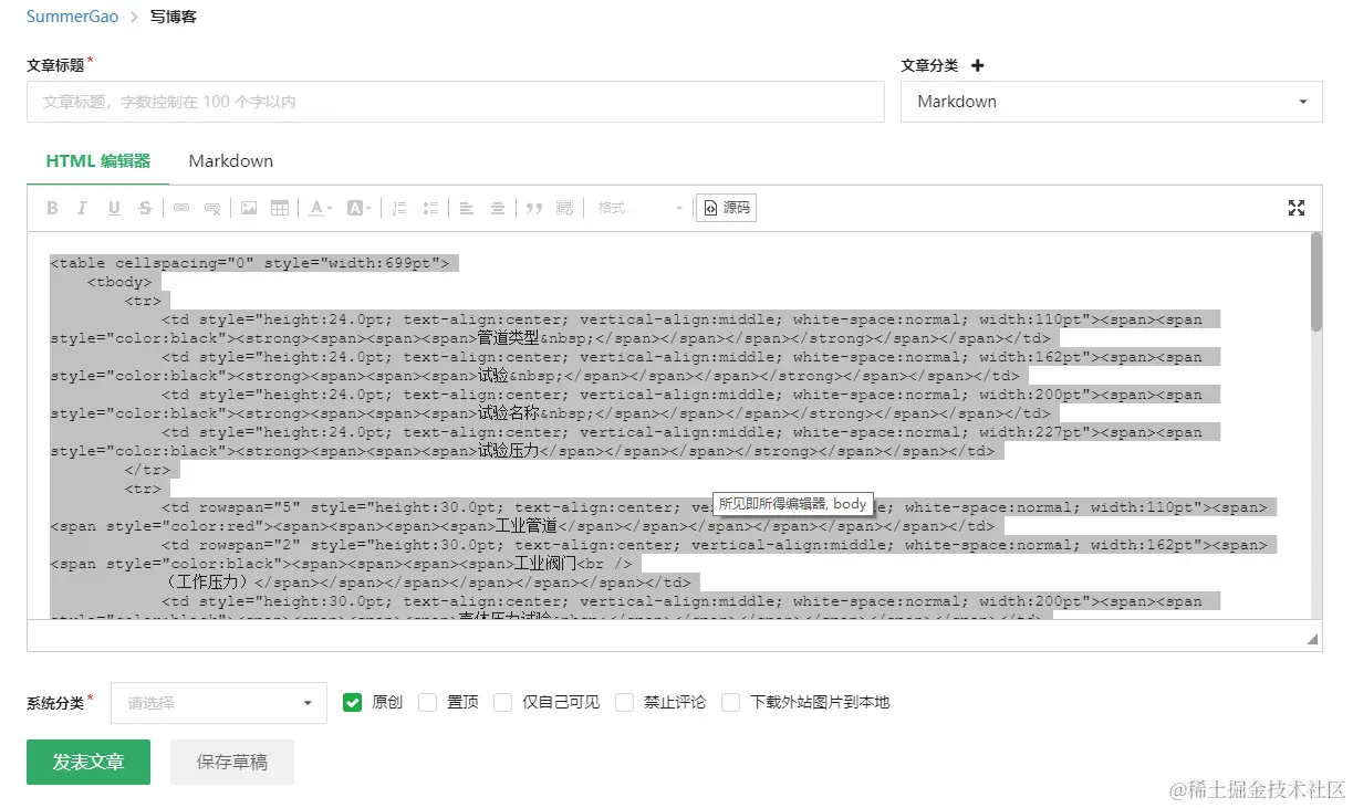 在VuePress中插入任意格式的表格 SummerGao 2023-10-17 292 阅读1分钟 巧借 Excel、开源中国博客HTML编辑器 实现在VuePress中插入任意格式表格数据。 1. 在Excel中编辑好自己的表格 2. 打开自己的开源中国博客网站 ① 打开网站后,新建一篇博客。 ② 将已编辑好的Excel表格复制到博客中。 ③ 预览博客中的表格没问题后点击源码按钮。 ④ Ctrl+A 复制所有源码内容到自己的Markdown文件中。 3. 预览VuePress中的表格效果