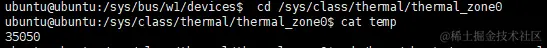 返回值除以1000为当前CPU温度值。即当前温度为35摄氏度。如下图所示