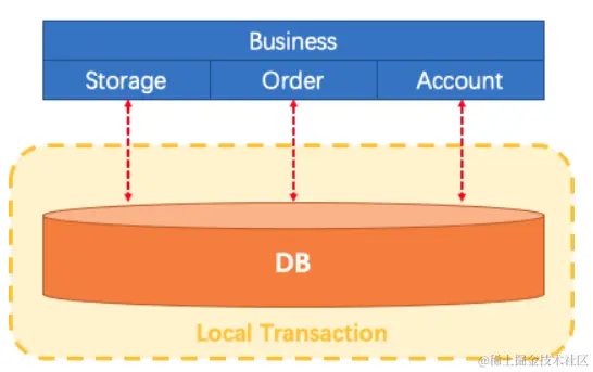 单体应用中,一个业务操作需要调用三个模块完成,此时数据的一致性由本地事务来保证。