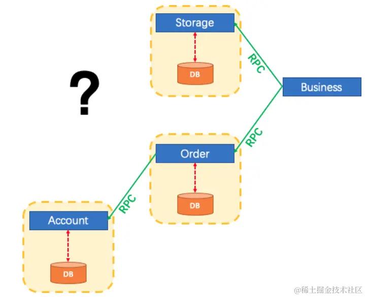 随着业务需求的变化,单体应用被拆分成微服务应用,原来的三个模块被拆分成三个独立的应用,分别使用独立的数据源,业务操作需要调用三个服务来完成。此时每个服务内部的数据一致性由本地事务来保证,但是全局的数据一致性问题没法保证。