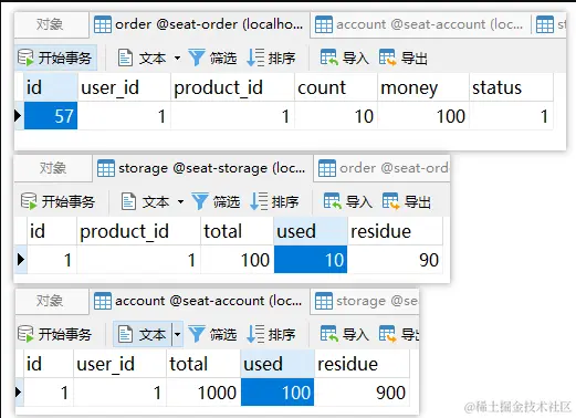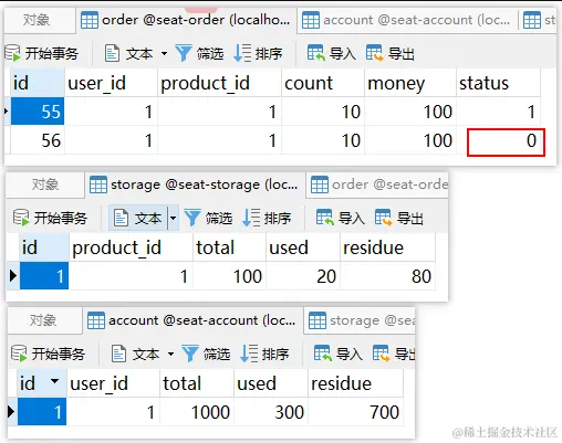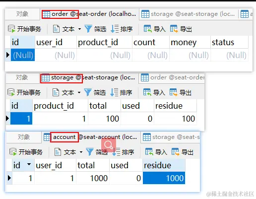 - 运行seata-order-service、seata-storage-service和seata-account-service三个服务;