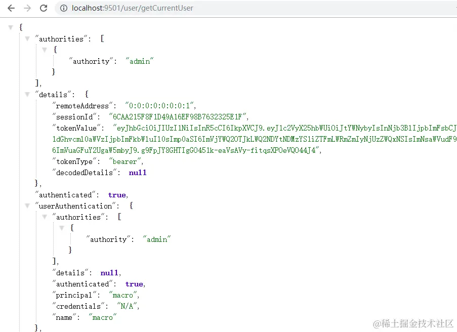 - 授权后会跳转到原来需要权限的接口地址,展示登录用户信息;