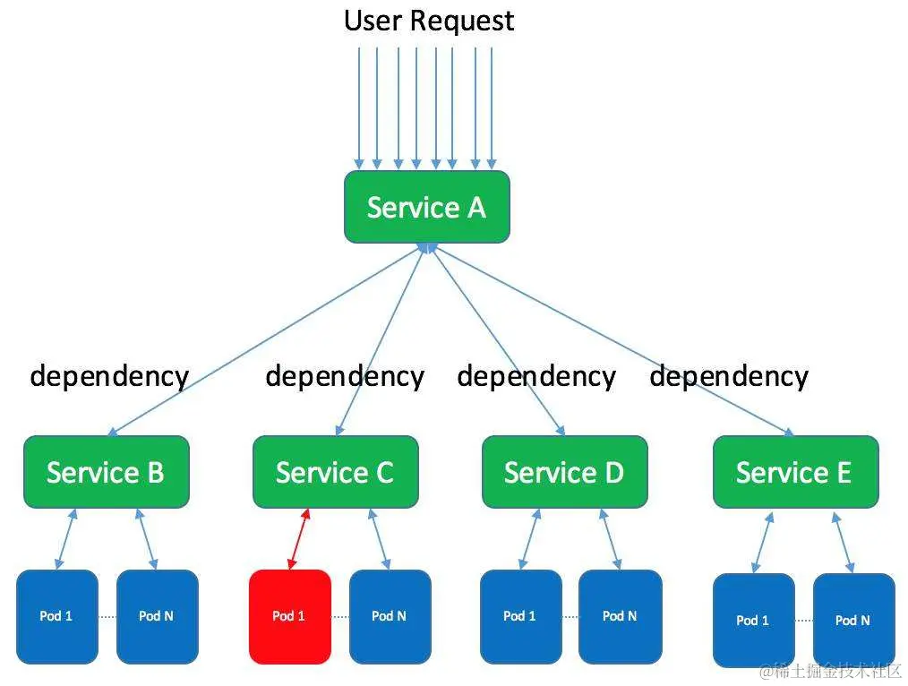 上面:service A、B、C、D 分别是业务组件,通过API Geteway进行业务访问。