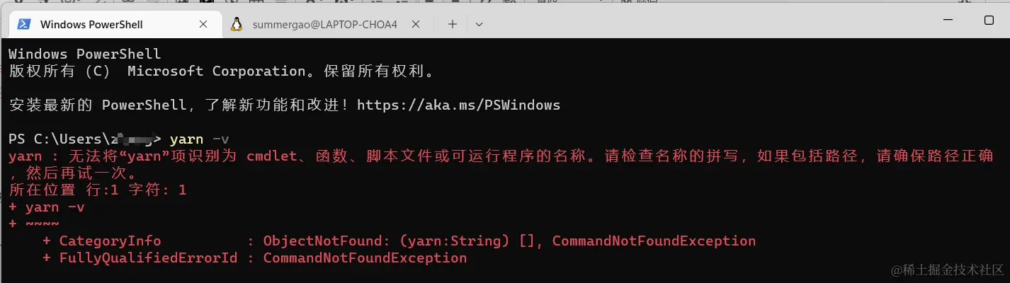 yarn : 无法将“yarn”项识别为 cmdlet、函数、脚本文件或可运行程序的名称。 SummerGao 2023-10-17 1,855 阅读1分钟 yarn : 无法将“yarn”项识别为 cmdlet、函数、脚本文件或可运行程序的名称。请检查名称的拼写,如果包括路径,请确保路径正确,然后再试一次 。 所在位置 行:1 字符: 1 + yarn install 解决: 1、检查本地是否安装yarn yarn -v 如果终端未成功出现yarn 的版本号,则本地没有安装yarn。 2、安装 yarn npm install -g yarn 3、检查yarn是否安装 yarn -v