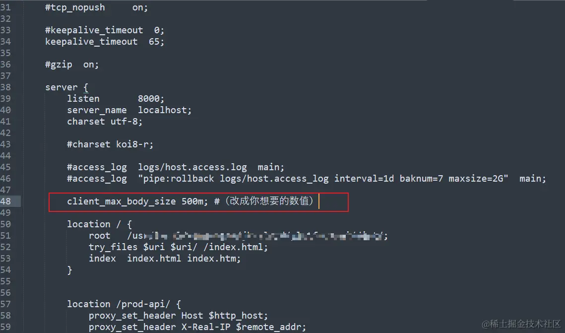 找到配置文件nginx.conf(如没有额外配置其他conf),在http{}或server{}或location{}节点下添加client_max_body_size