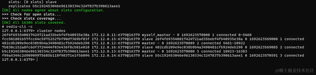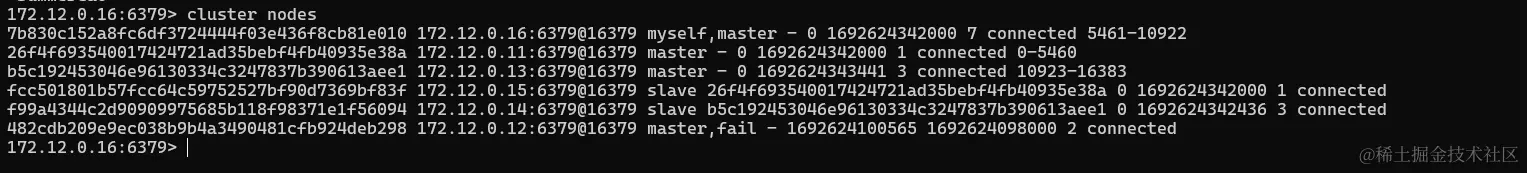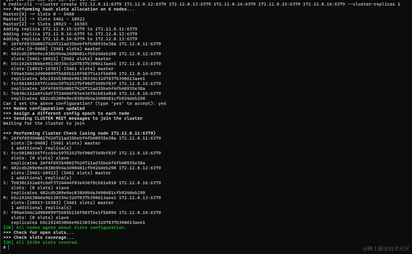 redis-cli --cluster create 172.12.0.11:6379 172.12.0.12:6379 172.12.0.13:6379 172.12.0.14:6379 172.12.0.15:6379 172.12.0.16:6379 --cluster-replicas 1