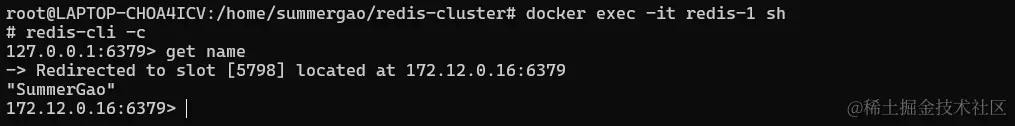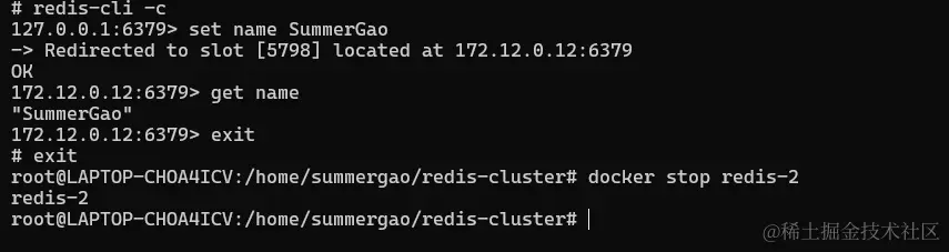 发现是由 172.12.0.12 处理的 get set 命令也就是 redis-2 ,此时我将 redis-2 容器停止,看从服务器是否能顶替 redis-2。