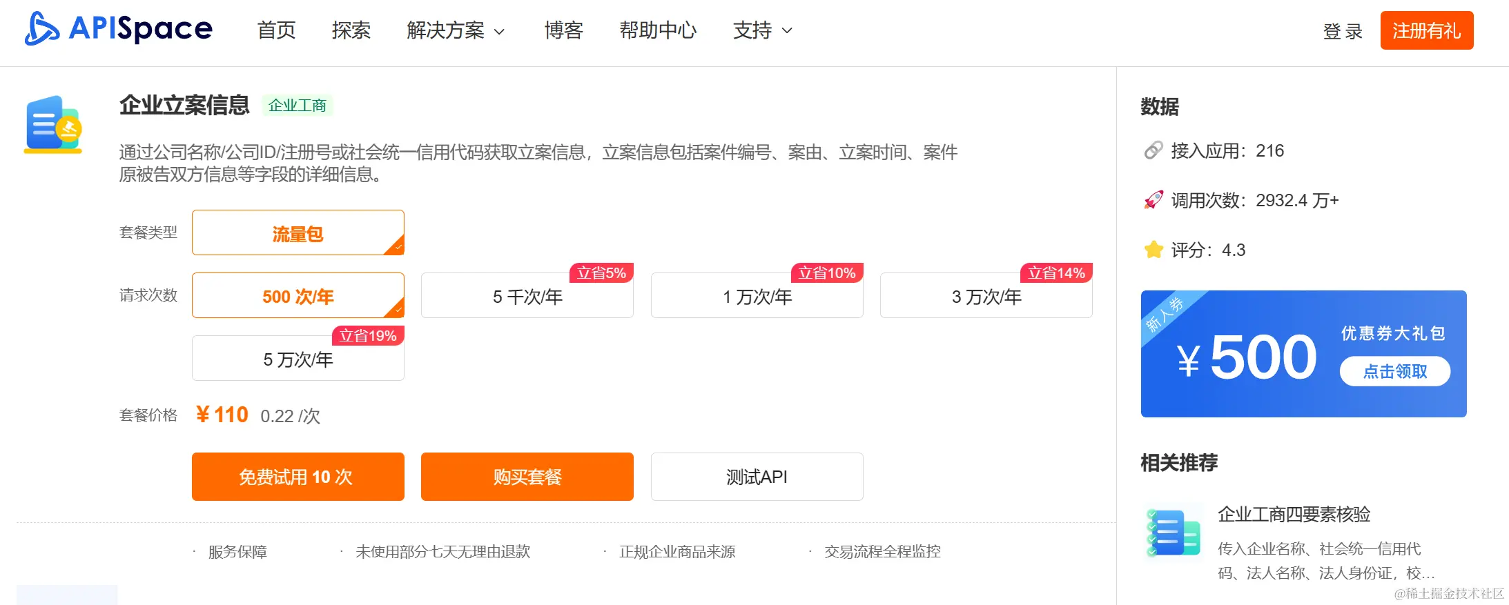 登录 APISpace,点击进入 企业立案信息 的接口详情页,就可以申请接口了。
