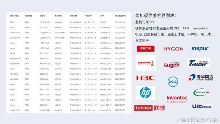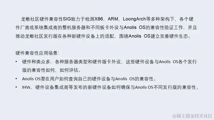 - 硬件种类众多,各种服务器类型和硬件版卡外设,这些硬件设备与 Anolis OS 各个发行版的兼容性如何?如何评估?