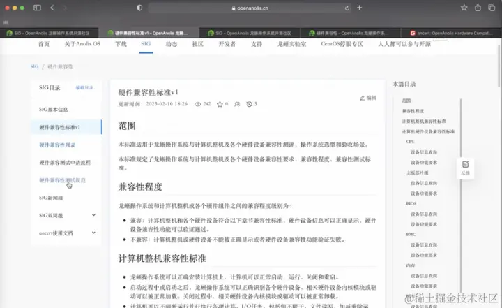 硬件兼容性 SIG 可以通过龙蜥社区首页选择“SIG-硬件兼容性”进入。上图展示的是 SIG 的主页,包括标准、测试规范,还有一些相关的文档。