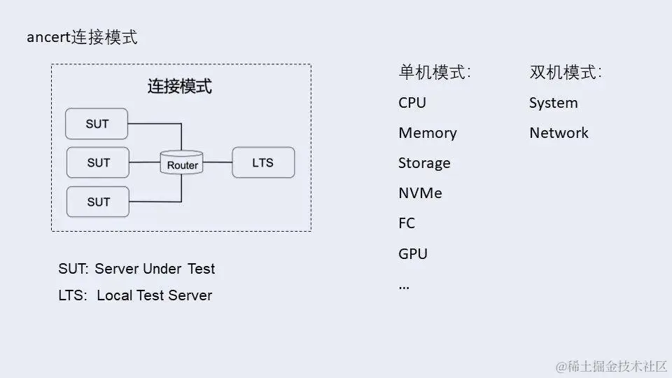 SUT 是指被测机,即 ancert 会运行在这台机器上,然后对这台机器上的某些硬件进行测试。整机测试和网络测试还需要一台辅助测试机 LTS,如果不包含网络测试,在一台机器上就可以搞定了。中间可以通过路由、交换机进行一对多的连接方式。CPU、Memory、Storage、NVMe、FC、GPU 等需要进行单机模式,System、Network 需要双机模式。