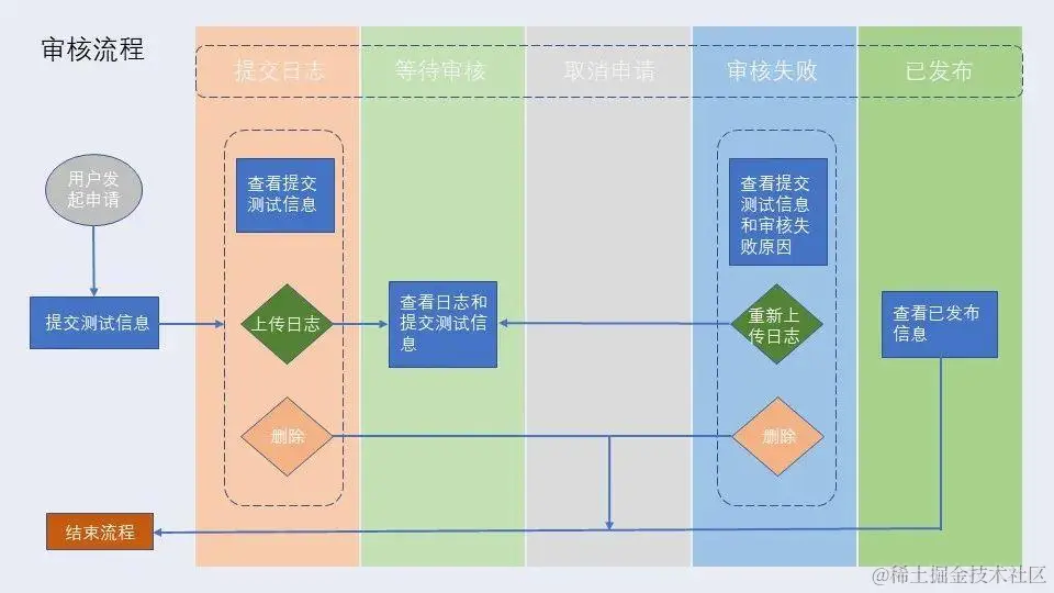 在这里,申请人提交完结果日志文件后会有一个状态的变更,状态会变成等待审核。如果在审核过程中发现有问题或者漏测了,可以取消申请。若是审核不通过,用户看到的状态就是审核失败,审核失败可以重新上传日志,再进行审核。当然在审核失败后,我们会通过邮箱或者钉钉和申请人取得联系,做进一步沟通。