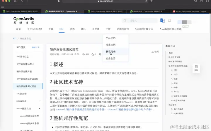 硬件兼容性 SIG 可以通过龙蜥社区首页(链接见文末)选择“SIG-硬件兼容性”进入。上图展示的是 SIG 的主页,包括测试标准、测试规范,还有用户手册等文档。