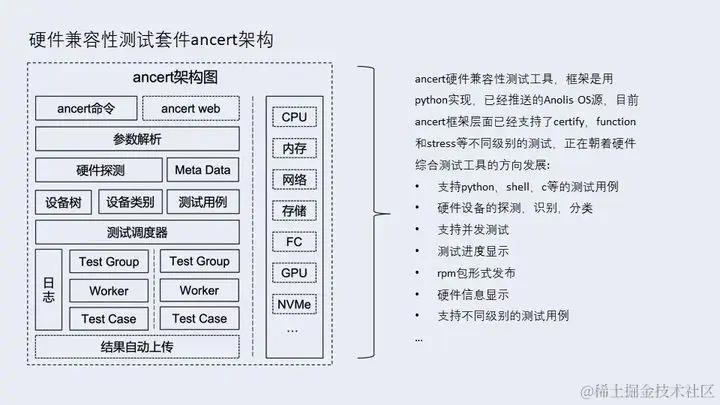 上图展示的是硬件兼容性测试套件 ancert 架构,目前已经支持了命令行的模式。ancert 的硬件探测模块,会探测整个系统上所有的硬件设备,构建设备树,并对这些设备进行分类。同时,还会把相应的测试用例和设备类别做 mapping。