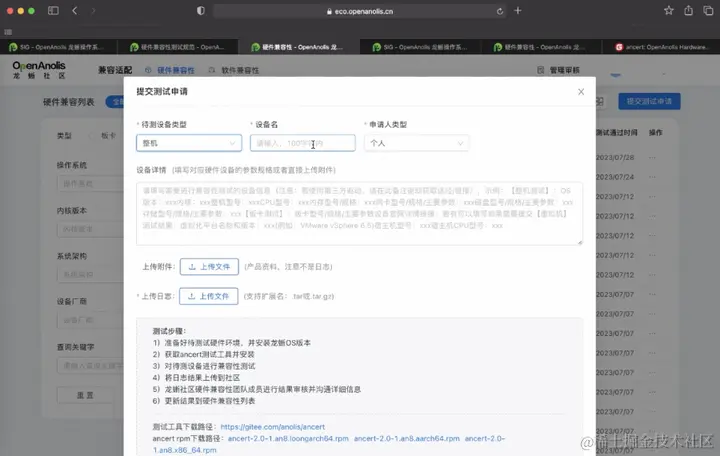 需要选择待测设备类型,填写设备名称,选择申请人类型。如果选择厂商的小伙伴,需要在注册账号签署 CLA 时填写一下所属企业的名称。下一步上传测试结果,然后提交申请。