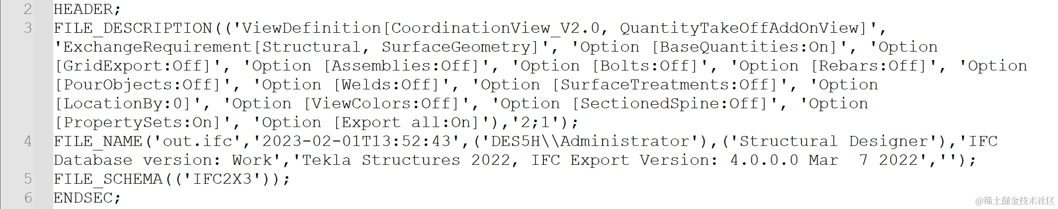 文件头段以“HEADER;”开始,以“ENDSEC;”结束,里面包含了有关ifc文件本身的信息,例如文件描述、使用的ifc标准版本等。
