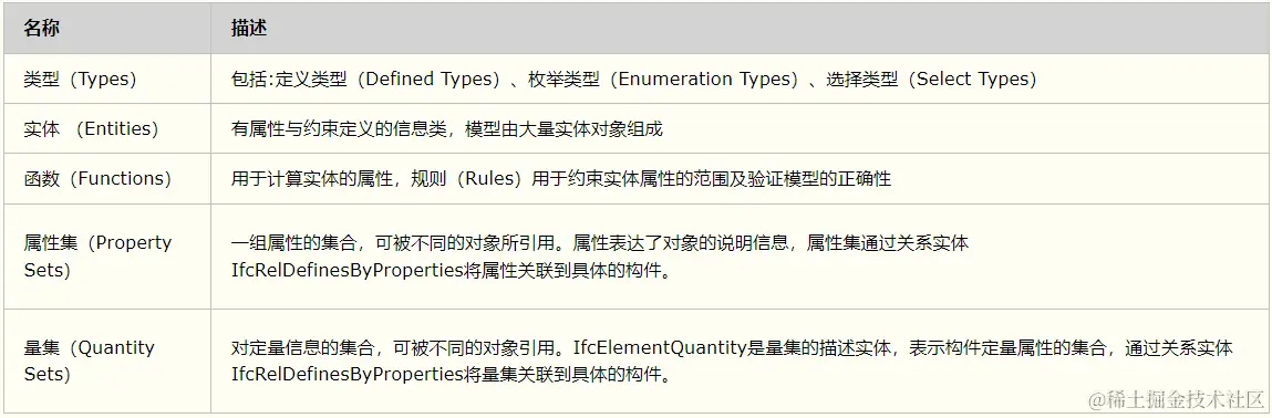 IFC架构将所有的对象与类按概念进行分类:类型、实体、函数、规则、属性集及量集。