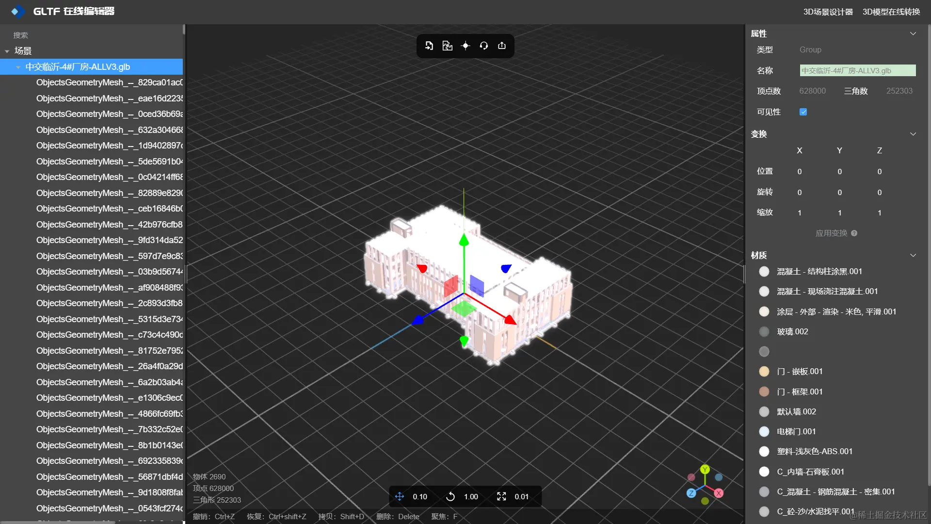 下一步,材质合批:只需要点击GLTF 编辑器工具栏上第二个按钮【合并相同材质的Mesh】,编辑器就会自动将模型中相同的材质进行合并,合并完成后将修改后的模型导出到本地GLB文件。