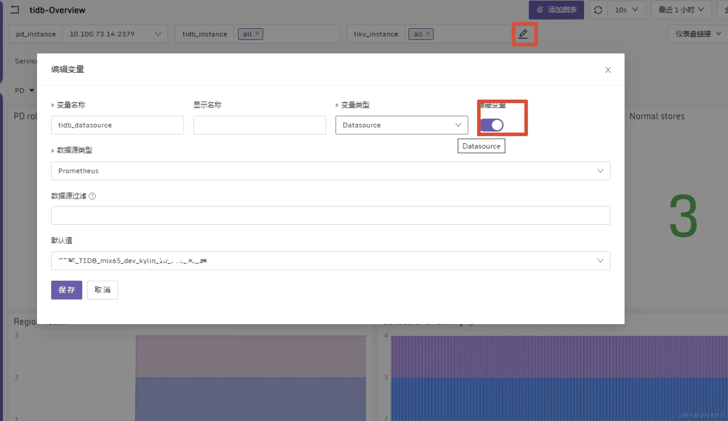 导入完成后进入图表-点击修改按钮-选择tidb_datasource-取消隐藏变量-保存