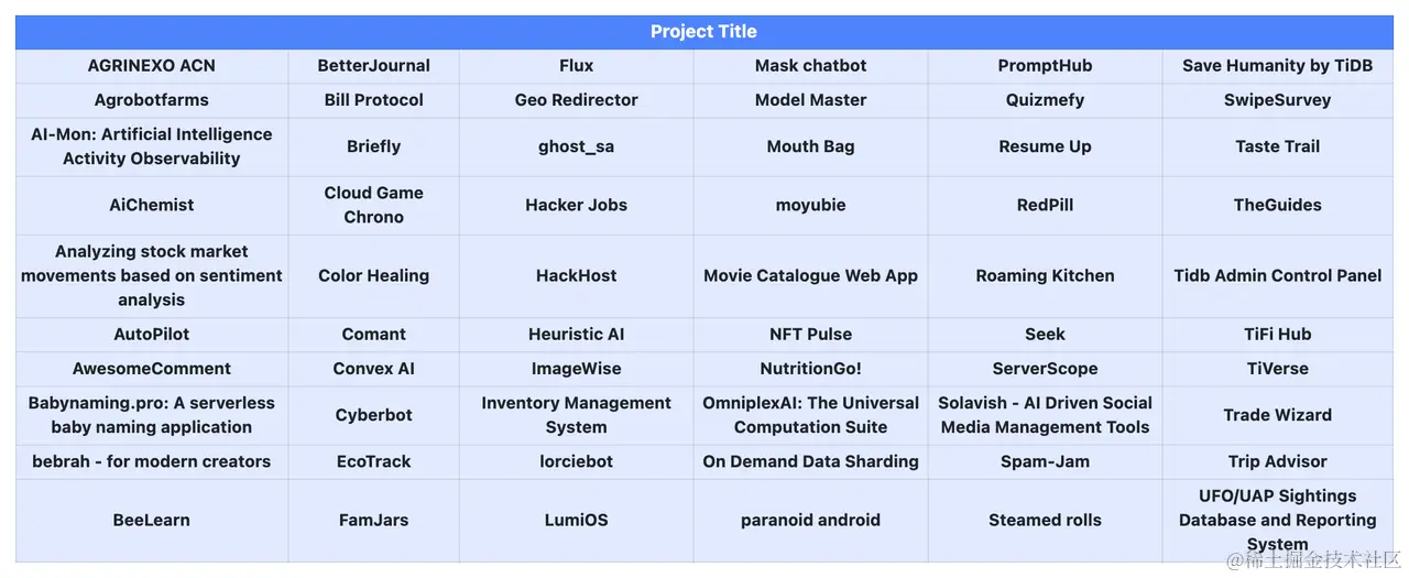 在收到的 100 个项目中,我们看到了 TiDB Serverless 所能带来的更多可能性。也看到了全球开发者们是如何充分发挥 TiDB Serverless 的优势来构建未来感的应用程序。