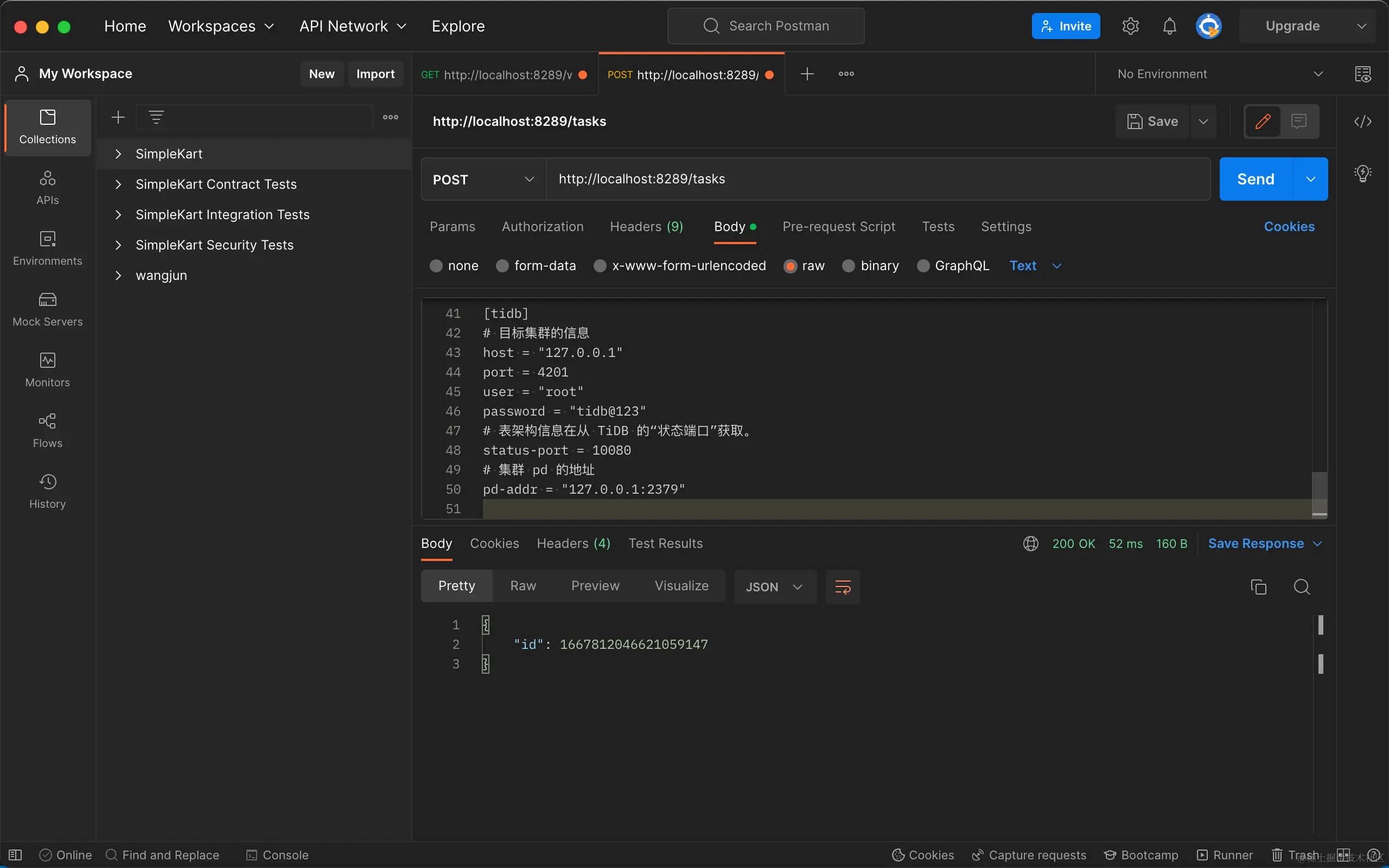 - POST /tasks,body 是配置文件,返回 json,字段 id 表示 task id。