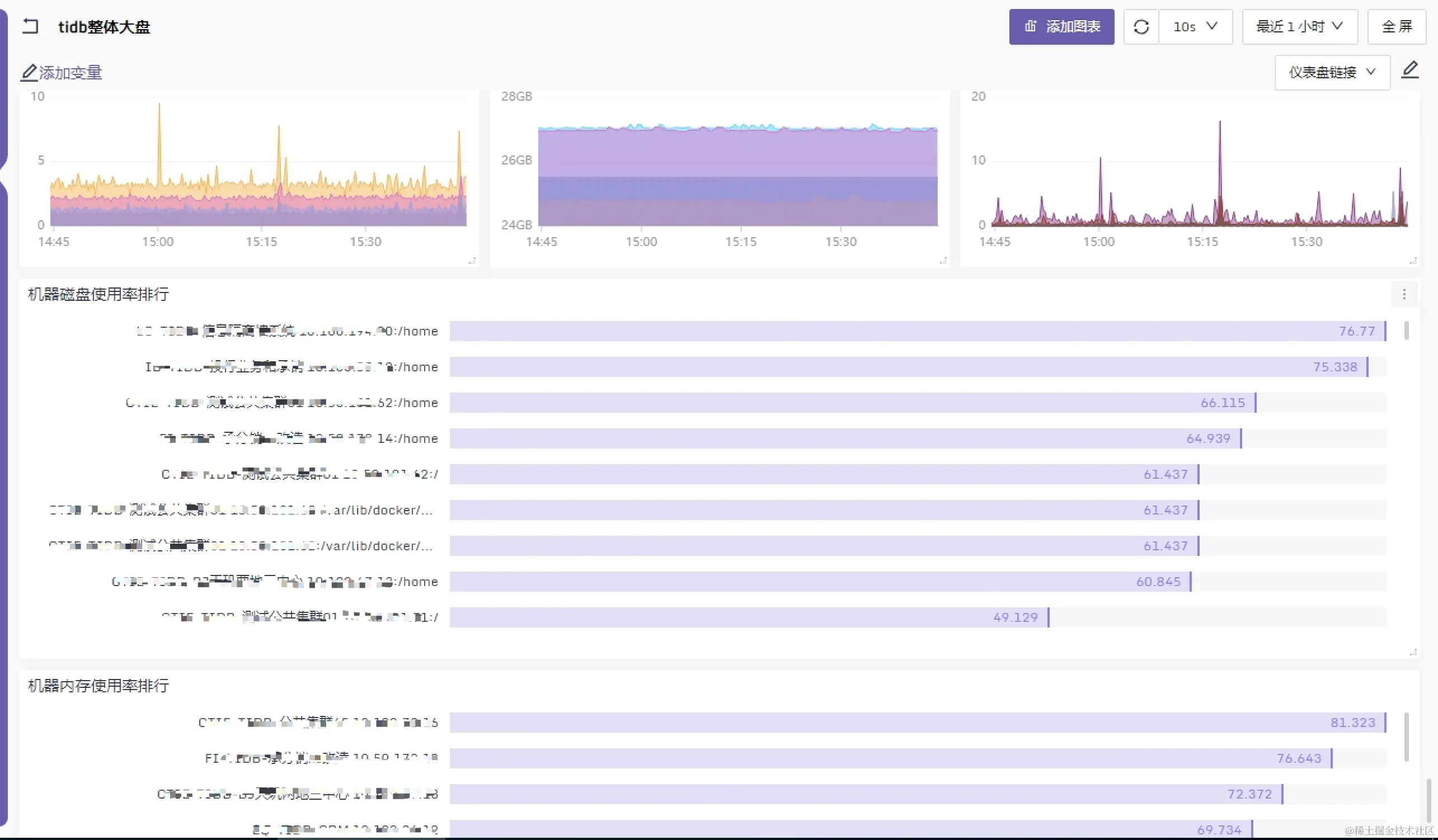 并且还可以将所有集群数据融合进同一个大盘,方便DBA监掌握百台机器资源使用情况。