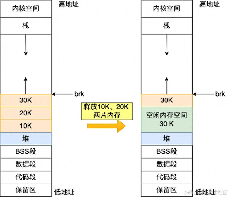 如果我们连续申请了 10k,20k,30k 这三片内存,如果 10k 和 20k 这两片释放了,变为了空闲内存空间,如果下次申请的内存小于 30k,那么就可以重用这个空闲内存空间。